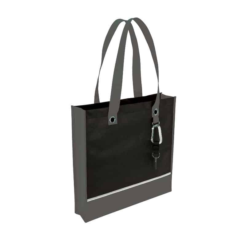 This two tone 80 gsm Nonwoven tote bag has shoulder length 24” long handles and is 100% recyclable. Accented with large metal eyelets and a metal D-ring, it is available in a choice of eight different color combinations.