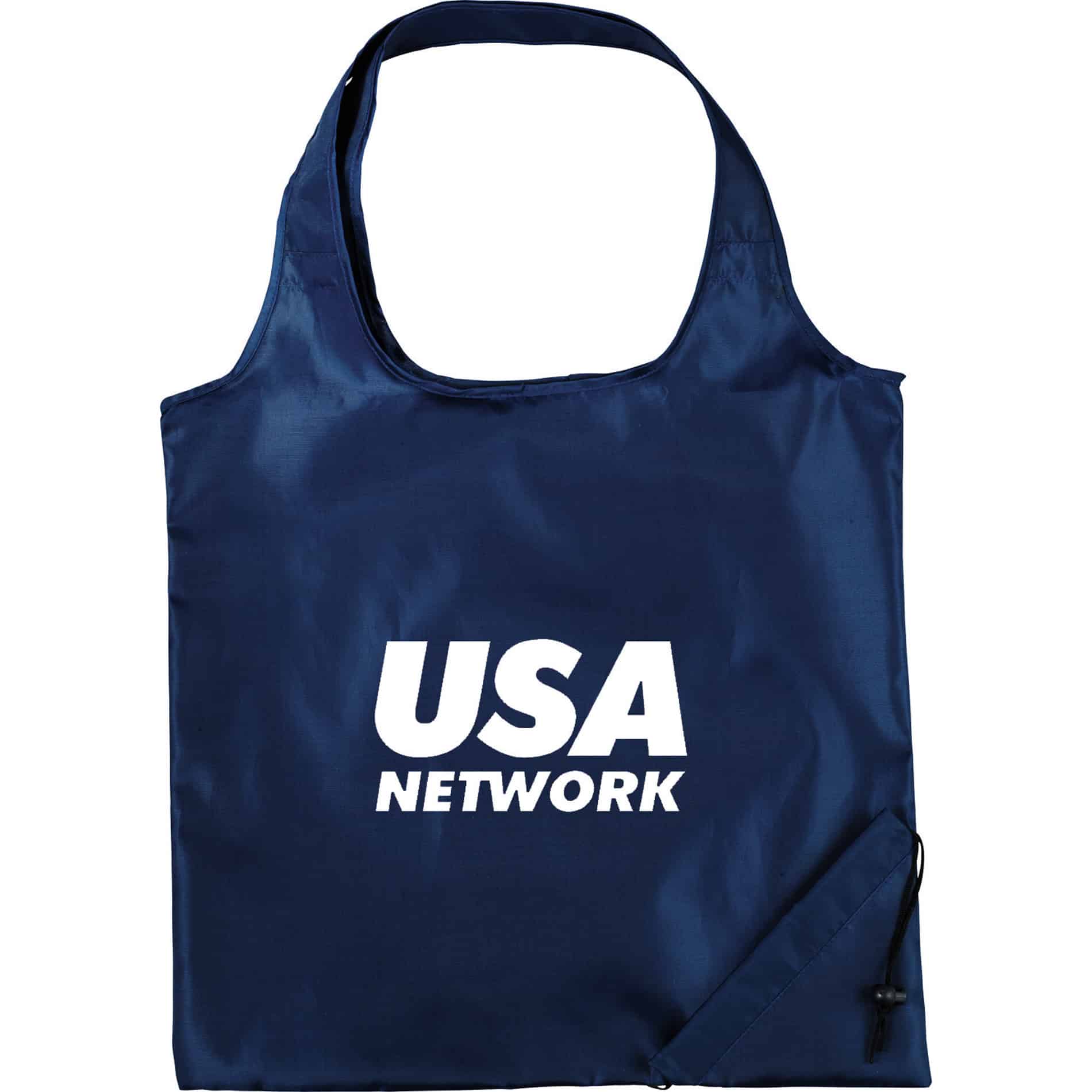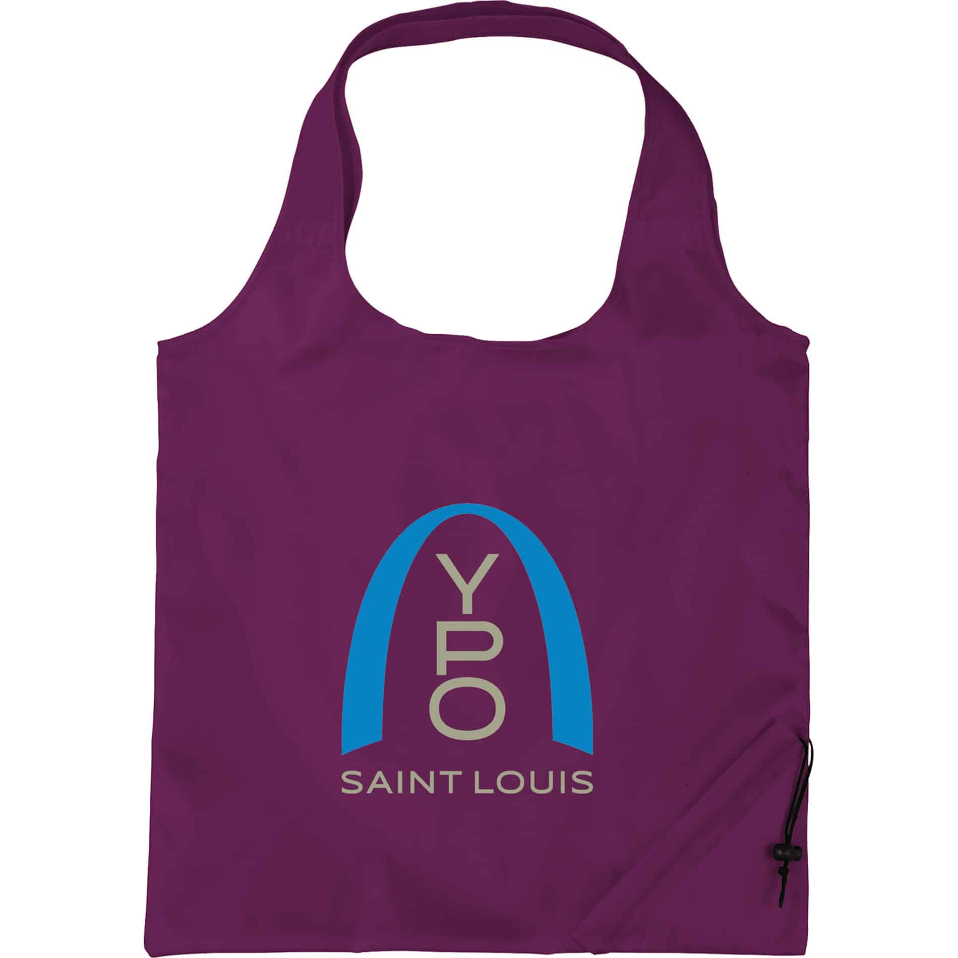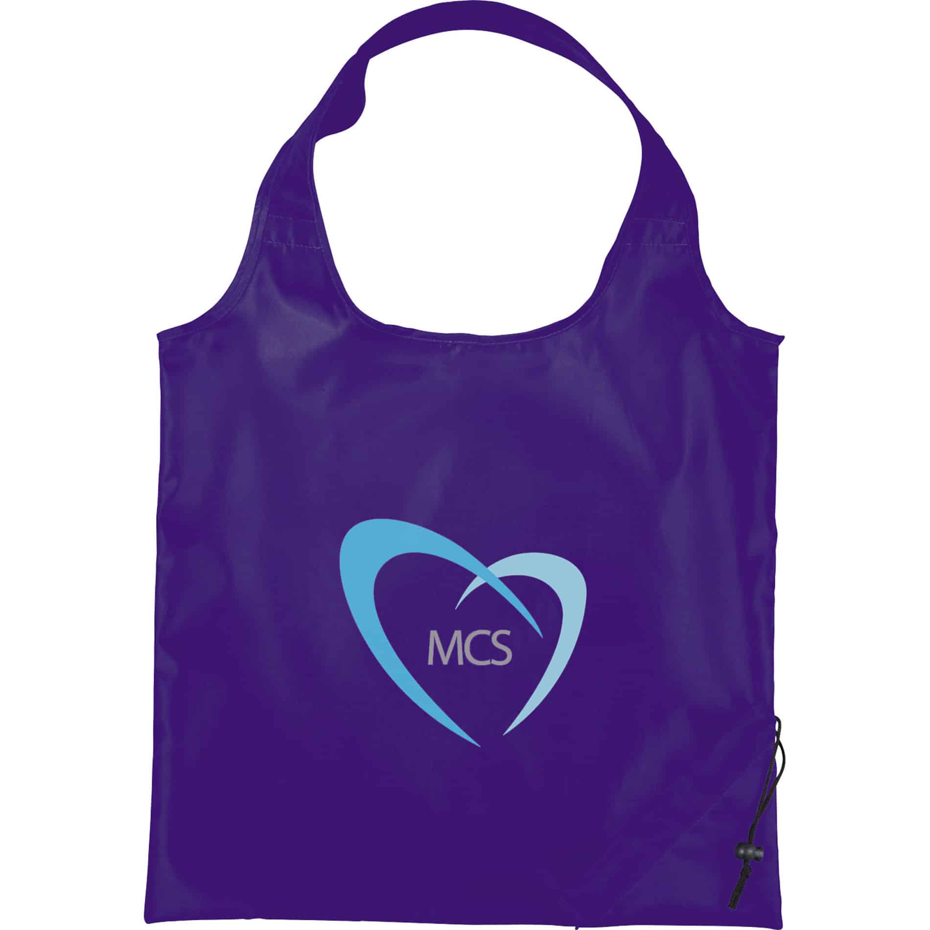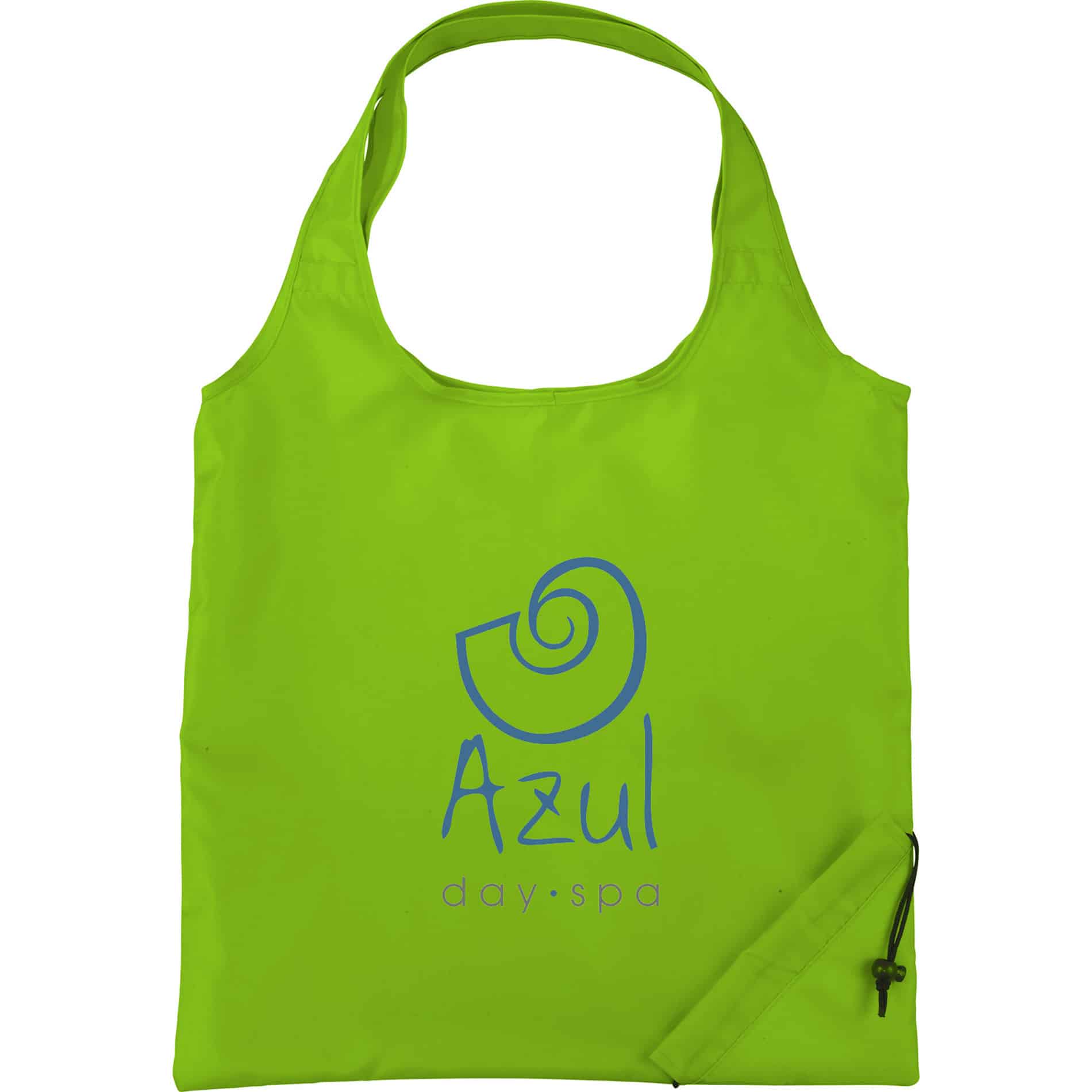 This convenient foldaway 210d polyester tote bag measures 16” wide x 15” high when fully opened and folds onto itself with a drawcord closure for easy carrying and storage. It is lightweight, earth friendly and reusable and is a great space saver.